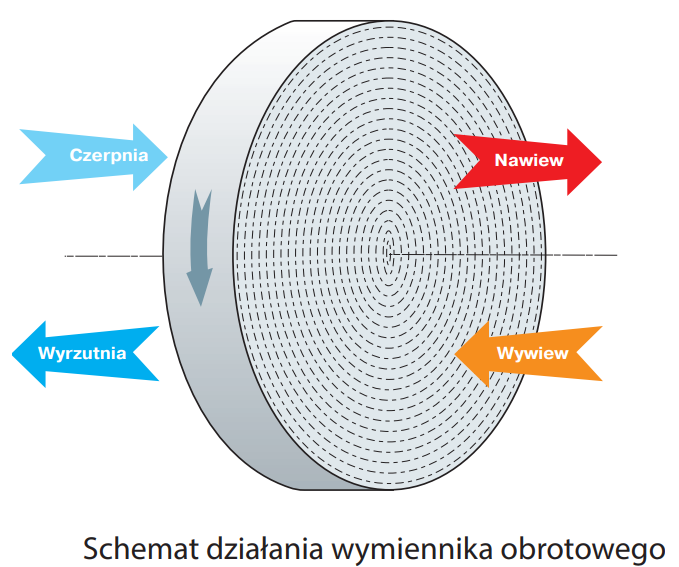 Centrale RV są wyposażone w obrotowy wymiennik ciepła zbudowany z walca wypełnionego falistą taśma aluminiową rozmieszczoną w taki sposób, aby strumienie powietrza nawiewanego i wywiewanego przechodząc przez wymiennik nie wchodziły ze sobą w bezpośredni kontakt. Podczas rotacji przez wnętrze wymiennika przechodzi najpierw nawiewane, a potem zużyte powietrze z pomieszczeń. W wyniku tego procesu dochodzi do przekazania ciepła i wilgoci zużytego powietrza strumieniowi napływającemu z zewnątrz. Zaletą wymiennika rotacyjnego w porównaniu z płytowym jest wyższa efektywność, odzysk wilgoci oraz bardzo niskie ryzyko zamarznięcia. W centralach z wymiennikiem obrotowym nie ma konieczności oprowadzania skroplin.