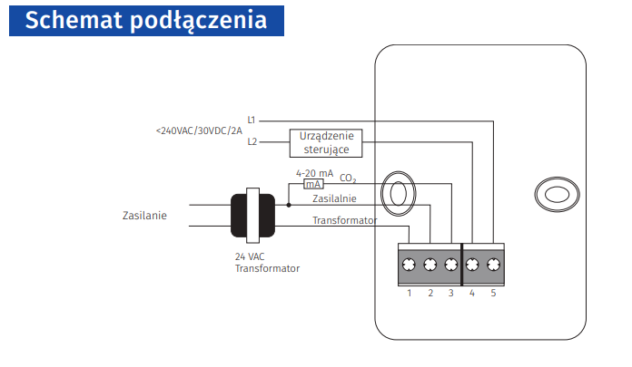 - Czujnik posiada dwa oddzielne wyjścia – beznapięciowy styk wyjścia przekaźnikowego i analogowe wyjście 0-10 V (możliwość regulacji sygnału: 2-10 V/0-20 mA/4-20 mA). Wyjście przekaźnikowe służy do włączania/wyłączania systemu wentylacyjnego w zależności od poziomu stężenia CO₂.