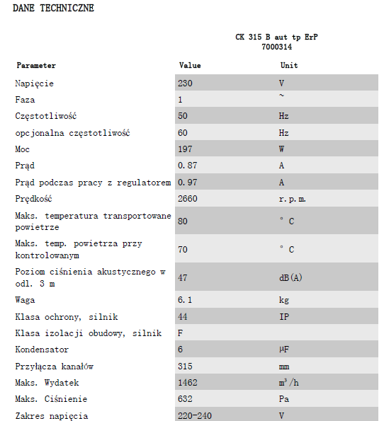 CK 315 B ErP - maksymalna wydajność 1462 m³/h