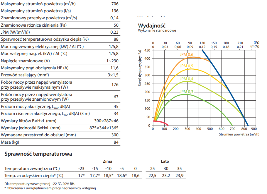 Maksymalny strumień powietrza - 706 m3/h, sprawność temperaturowa odzysku ciepła - 88%.