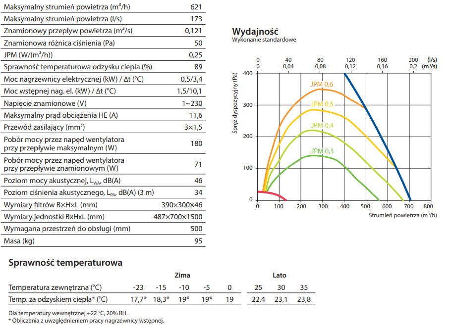 Maksymalny strumień powietrza - 621 m3/h, sprawność temperaturowa odzysku ciepła - 89%.