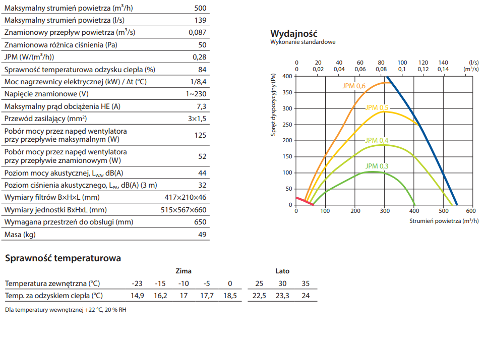 Maksymalny strumień powietrza - 500 m3/h. Sprawność temperaturowa odzysku ciepła - 84%.