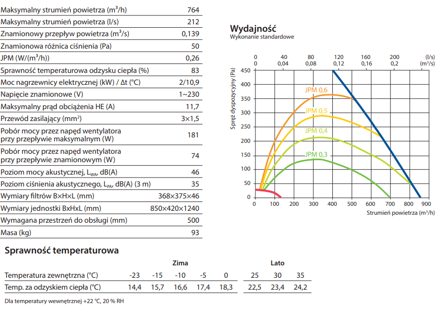 JPM - 0,26 (W/m3/h), pobór mocy przez napęd wentylatora przy przepływie maksymalnym - 181 W.