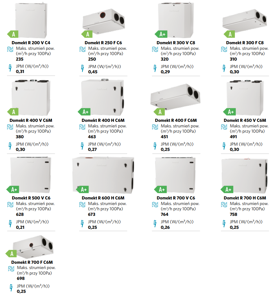 Poniżej przedstawione centrale wentylacyjne z odzyskiem ciepła serii Domekt, spełniają wymogi określone w Rozporządzeniu Delegowanym Komisji (UE) nr 1254/2014 z dnia 11 lipca 2014 r. oraz w Rozporządzeniu Parlamentu Europejskiego i Rady (UE) 2017/1369 z dnia 4 lipca 2017 r. ustanawiającym ramy etykietowania energetycznego i posiadają klasę efektywności energetycznej minimum A na podstawie karty produktu i etykiety energetycznej.