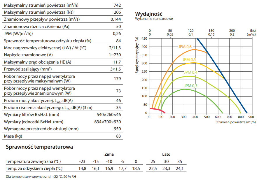 JPM - 0,26 (W/m3/h), pobór mocy przez napęd wentylatora przy przepływie maksymalnym - 179 W.