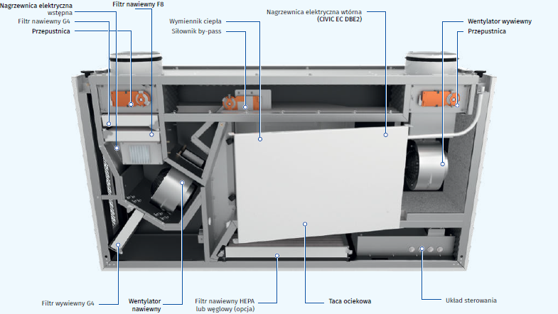 - Centrale CIVIC EC DB są wyposażone w przeciwprądowy wymiennik ciepła wykonany z polistyrenu.