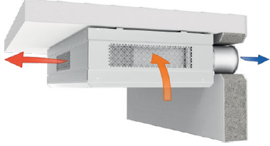 - Ciepłe zużyte powietrze z pomieszczenia przepływa przez filtr oraz wymiennik ciepła i jest usuwane na zewnątrz za pomocą wentylatora wyciągowego.