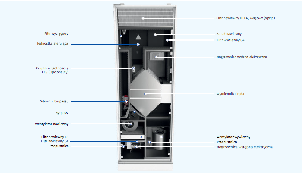 - Powietrze wywiewane jest oczyszczane w filtrze mini-pleat o klasie filtracji G4.
