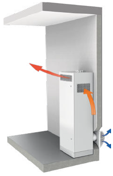 - Ciepłe zużyte powietrze z pomieszczenia przepływa przez filtr oraz wymiennik ciepła i jest usuwane na zewnątrz za pomocą wentylatora wyciągowego.