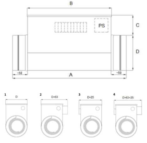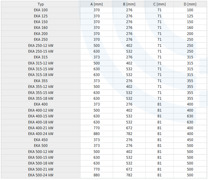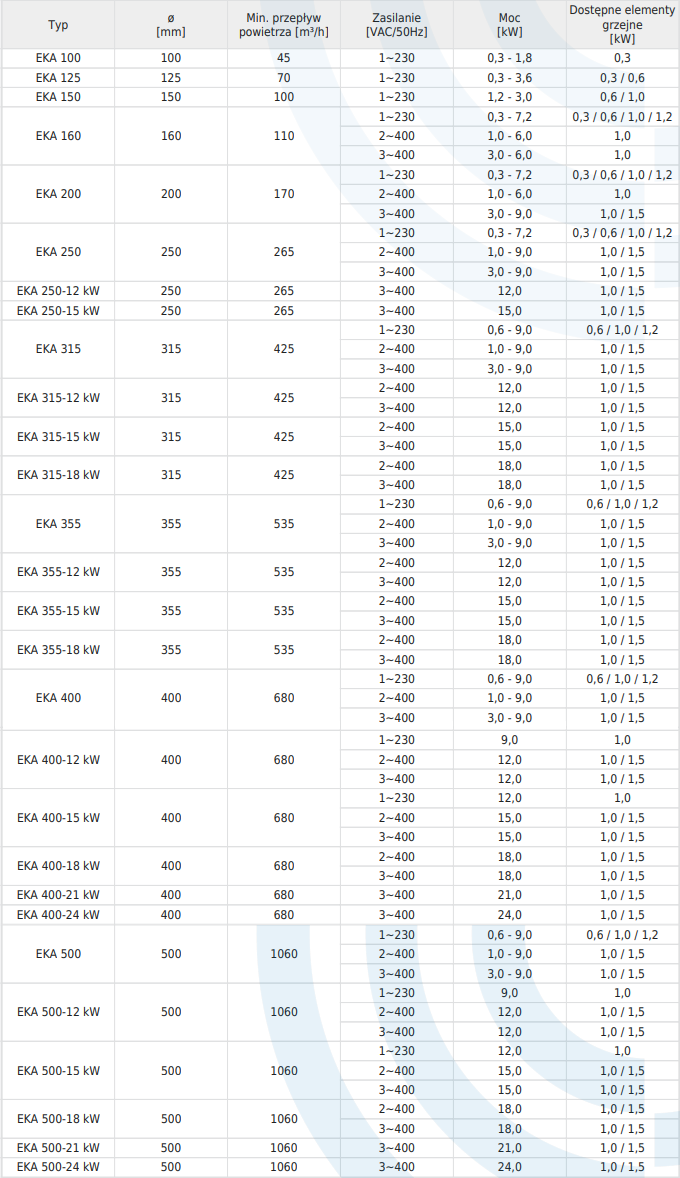 - EKA: nagrzewnica bez zintegrowanego sterowania (wymaga dokupienia regulatora mocy EKR i czujnika kanałowego TJK-10K);