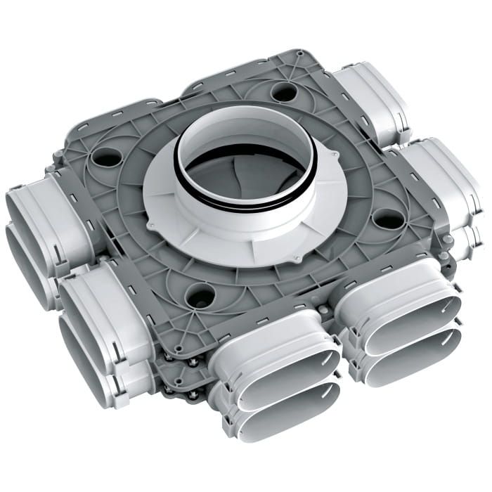 - Rozprowadzenie powietrza do kanałów elastycznych 52 mm w systemach wentylacji nawiewnej i wywiewnej pomieszczeń.