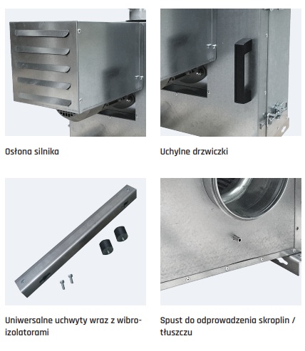 - silnik wraz z wirnikiem montowany na uchylnych drzwiczkach, zapewniających łatwy dostęp do wnętrza wentylatora i konserwację,