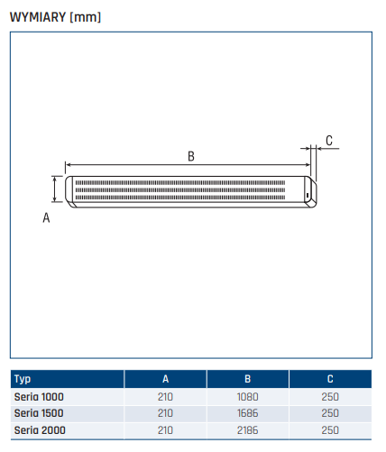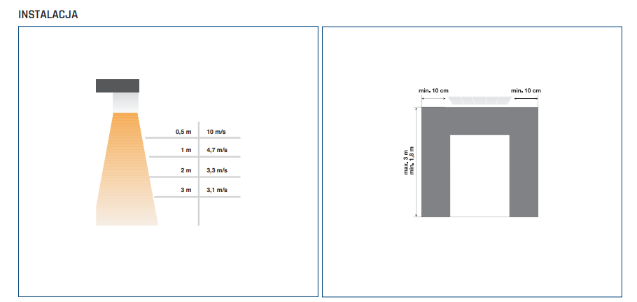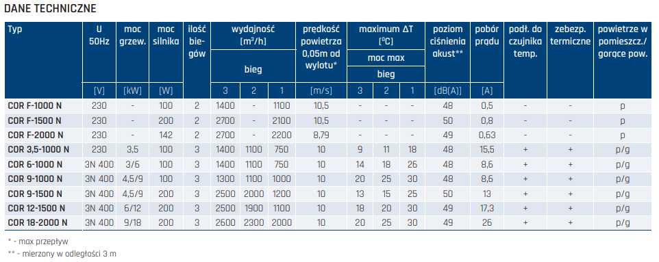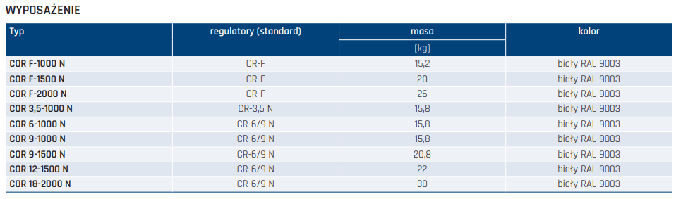 Elektryczne kurtyny powietrzne COR są przeznaczone do montażu ściennego nad otworami wejściowymi na wysokości od 1,8 do 3 metrów. Dostępne są trzy długości kurtyn: 1m, 1,5m i 2m.