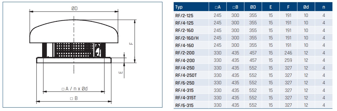 Wentylatory dachowe, wyciągowe RF przeznaczone są do systemów wentylacyjnych budynków o niskim stopniu zanieczyszczenia powietrza. Stosowane są między innymi w instalacjach wyciągowych z budynków mieszkalnych, supermarketów, hal przemysłowych, warsztatów itp.