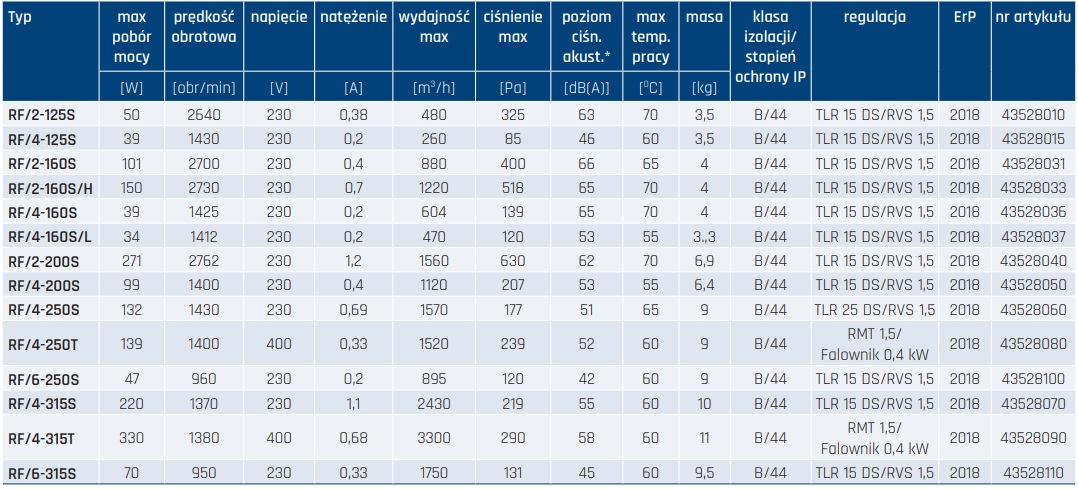 W wentylatorach RF (125-315) stosowane są wirniki z łopatkami pochylonymi do tyłu, wykonane z tworzywa sztucznego lub blachy aluminiowej (w zależności od modelu). Podstawa oraz obudowa wykonane są z blachy aluminiowej, czasza z blachy aluminiowej, siatka ochronna z ocynkowanej blachy stalowej.