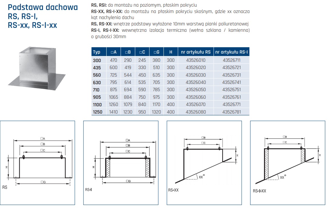 Podstawa dachowa RS-I do montażu na płaskim pokryciu skośnym, gdzie xx oznacza kąt nachylenia dachu, wewnętrzna izolacja termiczna (wełna szklana / kamienna) o grubości 30 mm.