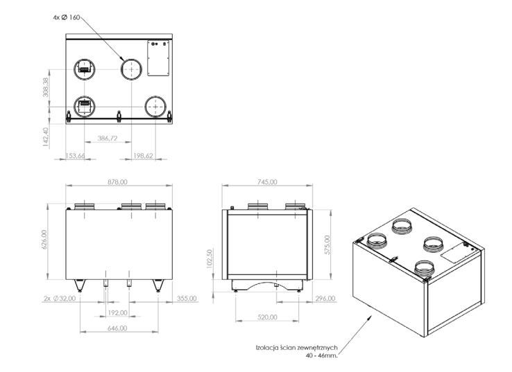 - OBUDOWA – wykonana w całości ze stali malowanej proszkowo, zaizolowana. Charakteryzuje się doskonałymi właściwościami tłumienia drgań, hałasu.