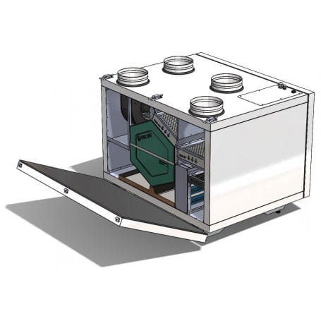 - WENTYLATORY – zastosowane zostały silniki elektro komutatorowe prądu stałego (EC) renomowanej firmy ZILABEG, EBM, ROSENBERG z technologią CONSTANT FLOW, dzięki której centrala utrzymuje stały zadany wydatek powietrza, dające gwarancję niezawodności oraz energooszczędnej cichej pracy. Wyposażone w zewnętrzny wirnik i wygięte do przodu łopatki. Silniki EC zapewniają wysoką wydajność i regulację w pełnym zakresie prędkości obrotowej wentylatora.