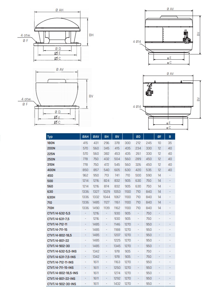 Pozostałe modele przeznaczone do pracy ciągłej w temperaturze do 120°C. Wentylatory posiadają certyfikat zgodności z normą PN-EN 12101-3, klasa F400°C/2h (z wyjątkiem modeli 140,180,200).