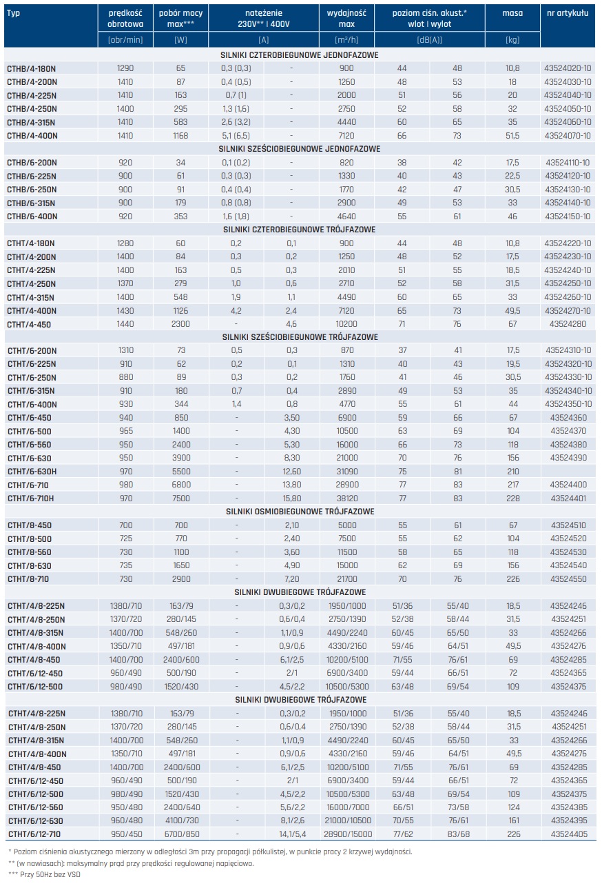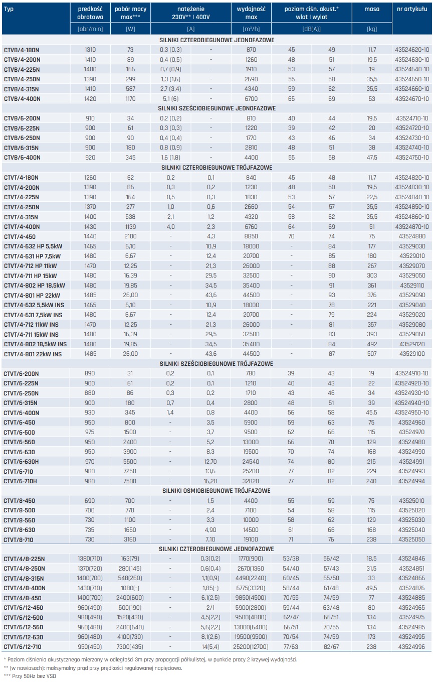 Silniki jednofazowe 230 V 50 Hz i trójfazowe 400 V 50 Hz. Wszystkie silniki posiadają ochronę IP55, klasę izolacji F i wyposażone są w bezobsługowe łożyska kulkowe.