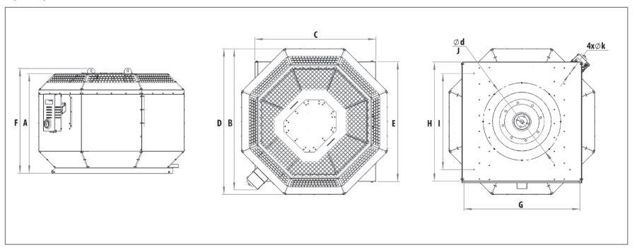 Dachowy wentylator promieniowy z wyrzutem pionowym, którego silnik zamontowany został poza strumieniem przepływającego powietrza. Wentylator został przystosowany do przetłaczania powietrza o maksymalnej temperaturze do 120°C. Obudowa została wykonana z profilowanej blachy aluminiowej AlMg3 odpornej na działanie wody morskiej oraz galwanizowanej blachy stalowej (płyta montażowa, wsporniki wewnętrzne). Ośmiokątny kształt obudowy wentylatora umożliwił redukcję straty ciśnienia przepływającego powietrza. Standardowo każdy wentylator posiada wylot powietrza zabezpieczony aluminiową blachą perforowaną, wyłącznik serwisowy oraz tacę ociekowa dla odprowadzania skroplin oraz wody opadowej z wnętrza wentylatora. Konstrukcja umożliwia odchylenie obudowy w celu przeprowadzenia czynności serwisowych w obrębie wirnika (przeglądy, czyszczenie).