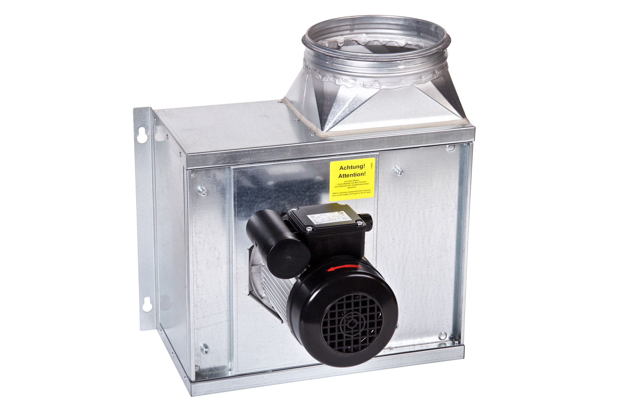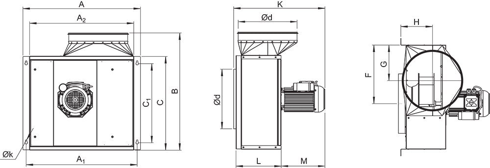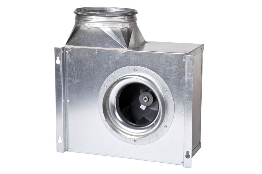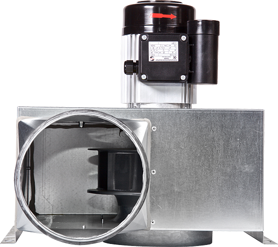 Wentylator promieniowy z silnikiem zlokalizowanym poza strumieniem przetłaczanego powietrza przeznaczony do stosowania w instalacjach wyciągowych kuchennych.