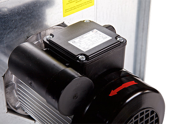 Jednofazowy (230V, 50Hz, IP54, klasa izolacji F) lub trójfazowy (400V, 50Hz, IP55, klasa izolacji F) asynchroniczny silnik elektryczny zlokalizowany całkowicie poza strumieniem usuwanego powietrza.