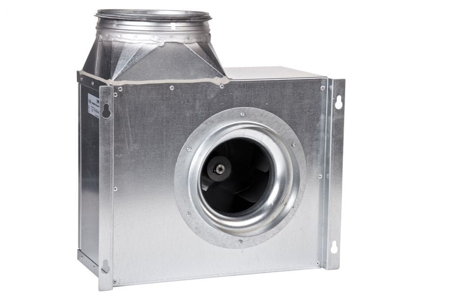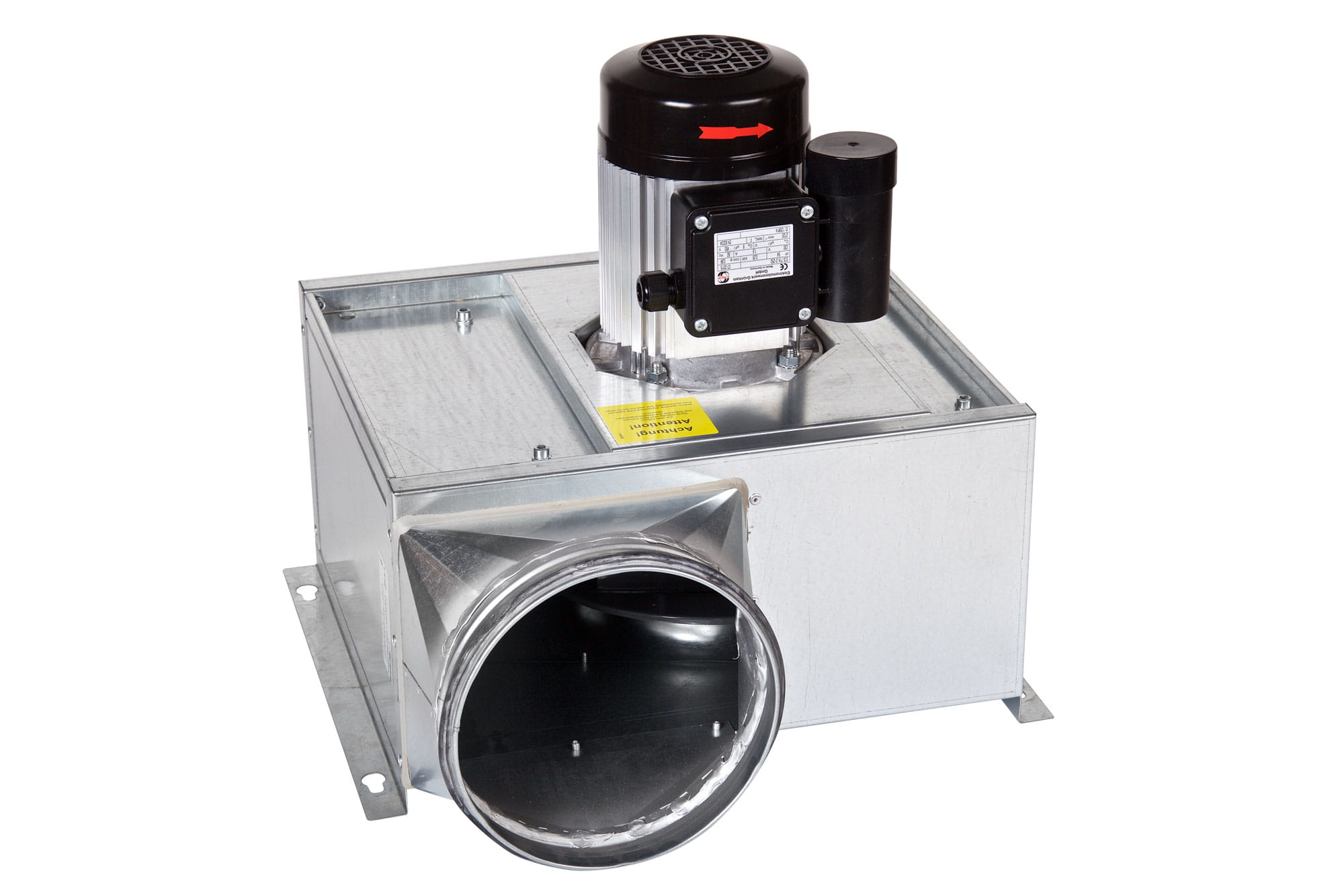 Wentylator promieniowy z silnikiem zlokalizowanym poza strumieniem przetłaczanego powietrza przeznaczony do stosowania w instalacjach wyciągowych kuchennych.