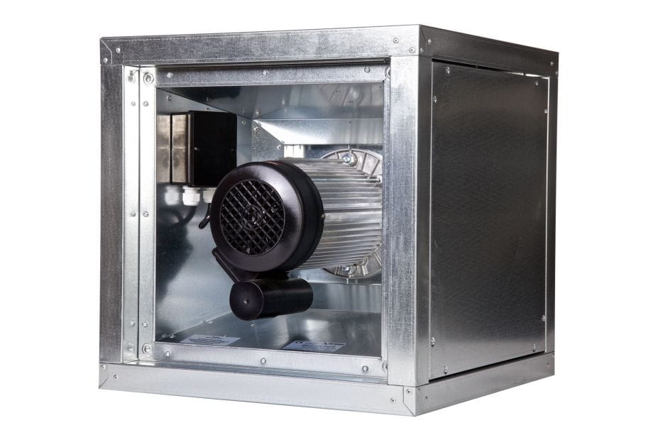 Promieniowy wentylator kanałowy z silnikiem oddzielonym od strumienia przepływającego powietrza. Obudowa w najwyższej klasie szczelności L1 (wg. EN 1886), wykonana z galwanizowanej blachy stalowej ma kształt sześcianu składającego się z ramy i paneli bocznych, izolowanych (poza panelem wlotowym) warstwą wełny mineralnej o grubości 30mm. W wykonaniu standardowym wlot stanowi wyproflowany pierścień bez króćca przyłączeniowego. Wylot uzyskuje się przez zdjęcie jednego z izolowanych paneli bocznych. Wylot można skonfgurować względem wlotu tylko pod kątem 90°. Po stronie wylotu zastosować można panele USB wyposażone w okrągłe króćce przyłączeniowe lub panele USR z redukcją do przyłącza okrągłego. Po stronie wlotu istnieje możliwość montażu okrągłych króćcy wlotowych ASB. W celu ograniczenia dodatkowych oporów, które powstaną przy stosowaniu powyższych paneli i króćców należy zwrócić szczególną uwagę na zachowanie odcinków prostych kanałów oraz króćców o jak największej średnicy przyłączeniowej. W podstawie wentylatora zlokalizowany został króciec skroplin (gwint wewnętrzny). Instalacja powinna być wyposażona w stosowne filtry / łapacze tłuszczu.